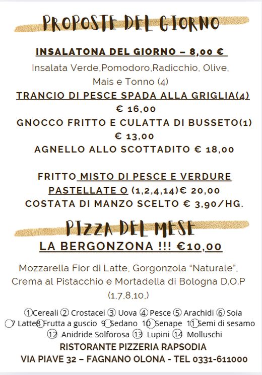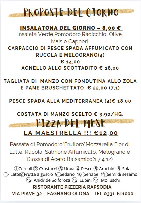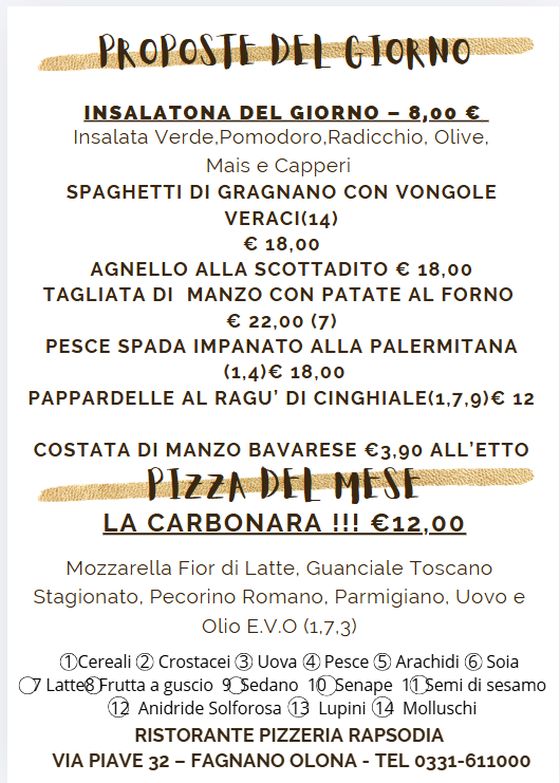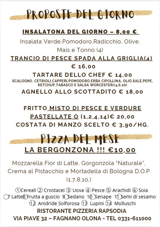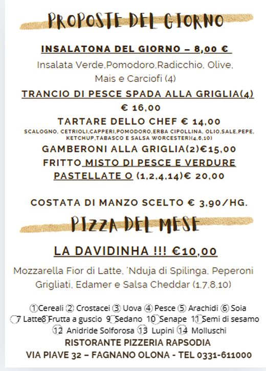 Al Rapsodia, il menù del giorno è disponibile esclusivamente a pranzo, offrendo una selezione sempre diversa di primi, secondi e contorni. Ogni giorno proponiamo piatti nuovi, preparati con ingredienti freschi e di stagione, per garantirvi un pranzo ricco di sapore e qualità.